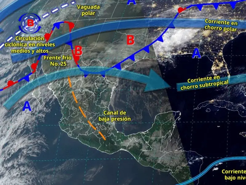 El frente frío número 25 se extenderá sobre el noroeste, norte y noreste del territorio nacional, mantendrá la interacción con una circulación ciclónica en niveles medios y altos de la atmósfera y con la corriente en chorro subtropical, generando ambiente frío a gélido en zonas montañosas.