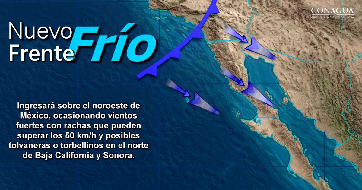 Un nuevo frente frío ingresará al noroeste de la República Mexicana y ocasionará vientos fuertes con rachas que pueden ser mayores a 50 km/h y posibles tolvaneras o torbellinos en el norte de Baja California y Sonora.