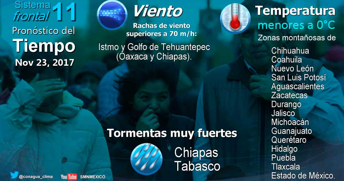 Se prevé evento de Norte con rachas superiores a 70 kilómetros por hora (km/h) en el Istmo y el Golfo de Tehuantepec y de hasta 60 km/h en el sur del Golfo de México y la Península de Yucatán; esta condición disminuirá en el transcurso de la tarde.