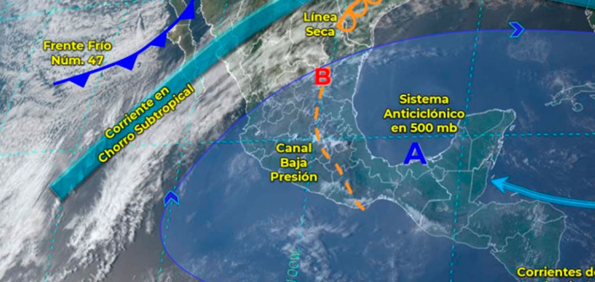 Por otro lado, un canal de baja presión en el oriente del territorio nacional y el ingreso de humedad del Golfo de México, originaran lluvias aisladas.