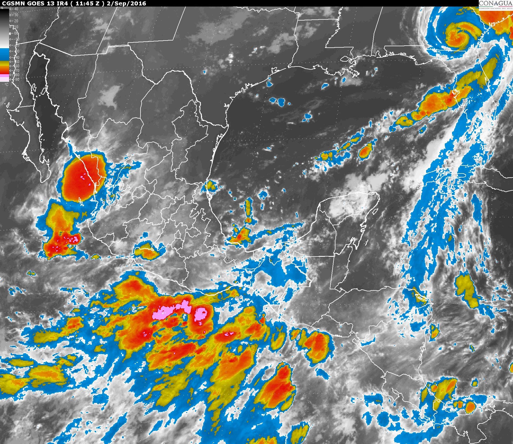 Otro canal de baja presión que se extenderá en el norte, el occidente y el centro de la República Mexicana, en combinación con la entrada de humedad del Océano Pacífico, generará tormentas muy fuertes (de 50 a 75 mm) en sitios de Nayarit, Jalisco, Colima, Michoacán, Estado de México, Ciudad de México y Morelos; tormentas fuertes (de 25 a 50 mm) en áreas de Tamaulipas, San Luis Potosí, Querétaro, Hidalgo y Tlaxcala; lluvias con intervalos de chubascos (de 5.1 a 25 mm) en Chihuahua, Coahuila, Nuevo León, Zacatecas, Aguascalientes, Durango y Guanajuato, y lluvias escasas (de 0.1 a 5 mm) en Sonora.