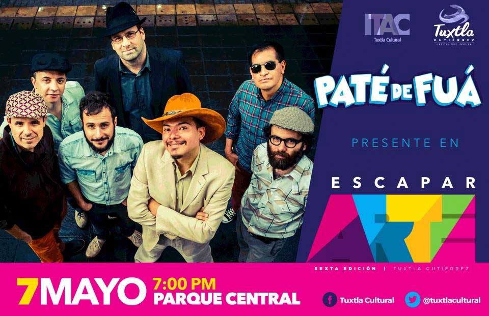 En Escapararte se brindará el homenaje a dos grandes artistas chiapanecos: César Corzo y Reynaldo Velázquez y el magno concierto de Paté de Fuá en el Parque Central el 7 de mayo a las 8 pm, agrupación musical que destaca por su diversidad sonora que mezcla jazz, tango, tarantelas, dixieland y musette; ganadores de dos Lunas del Auditorio, tres Indie-O Music Awards y nominados a los Grammy Latino.