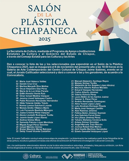 La Secretaría de Cultura, mediante el Programa de Apoyo a Instituciones Estatales de Cultura, y el Gobierno del Estado de Chiapas, a través del Consejo Estatal para las Culturas y las Artes (Coneculta), dieron a conocer la lista de seleccionados para participar en el Salón de la Plástica Chiapaneca 2025.