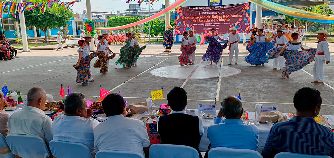La Zona escolar 006 de secundarias del estado, llevó a cabo la demostración de bailes regionales de Chiapas, con el objetivo de rescatar y mantener vivas las tradiciones, como también las expresiones culturales que son parte del folclor mexicano, donde los alumnos demostraron sus capacidades artísticas en la danza, además del desfile de trajes regionales que engalanaron este gran evento.