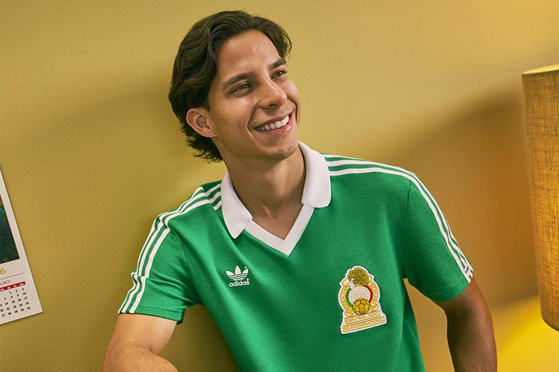 La playera es de color verde, corte ajustado, cuello ‘V’ en color blanco, las rayas blancas de la marca en los hombros, el escudo bordado retro de México a la altura del corazón con la leyenda “Federación Mexicana de Futbol Asoc. Selección Nacional” y el logo trifolio que utilizó la marca en la década de los 70.