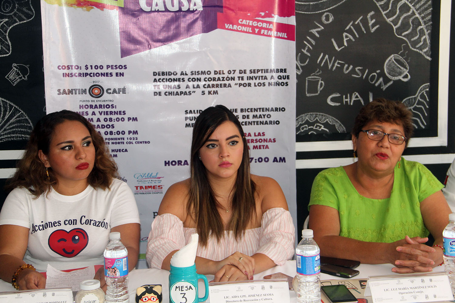 La Secretaría de la Juventud, Recreación y Deporte (SJRyD), en coordinación con las fundaciones Acciones de Corazón, Operación Conejo y Juárez Arango Chiapas, sumaron esfuerzos para organizar una carrera pedestre de 5 kilómetros, una charreada y un desfile de modas para recaudar fondos y apoyar a los niños afectados en el pasado sismo del 7 de septiembre.