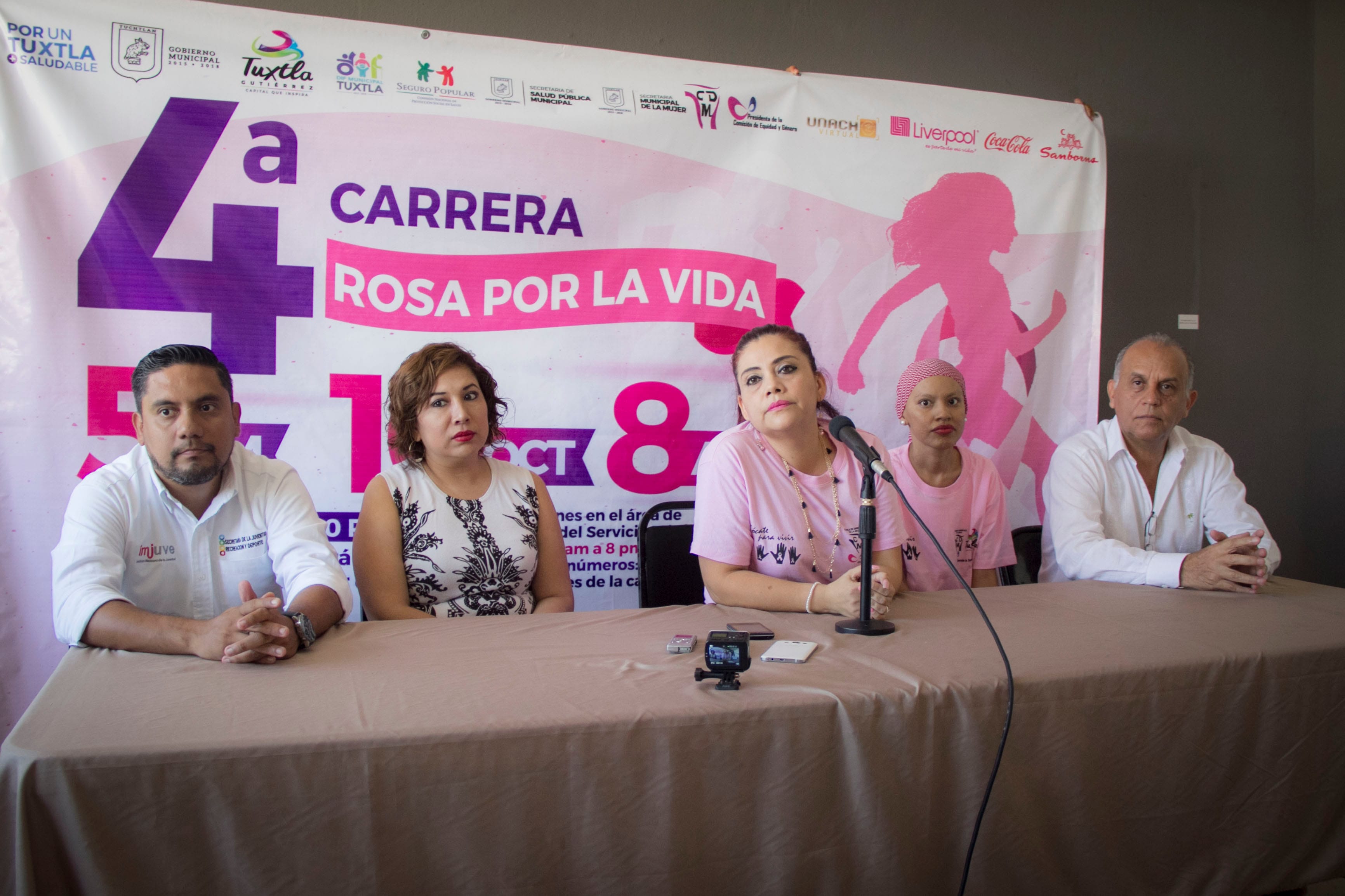 En el marco de la conmemoración de la Lucha contra el Cáncer de Mama, autoridades de la Secretaría de la Juventud, Recreación y Deporte (SJRyD), que encabeza José Luis Orantes Costanzo y la Clínica de la Mujer Poniente del Ayuntamiento de esta ciudad; anunciaron la organización de su cuarta edición de la carrera pedestre con distintivo altruista “Rosa por la Vida”, que se efectuará el domingo 16 de octubre a partir de las 8 de la mañana en la Tuxtla Vía Recreativa.