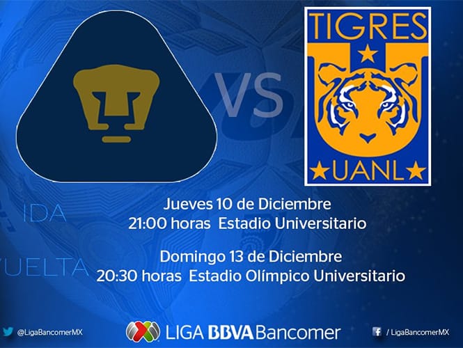 La Liga MX dio a conocer las fechas y horarios en los que se llevarán a cabo los partidos de la final del torneo Apertura 2015 que disputaránPumas y Tigres.