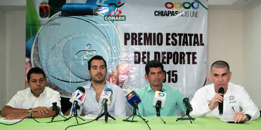 La Comisión de Cultura Física y Deporte (CONADE) y el Gobierno del Estado de Chiapas a través de la Secretaría de la Juventud, Recreación y Deporte (SJRyD), difundieron este día la convocatoria para el “Premio Estatal del Deporte” 2015, que consiste en reconocer con estímulos económicos a las y los mejores deportistas y entrenadores que por su trayectoria y relevancia en resultados hayan figurado en los eventos nacionales e internacionales.