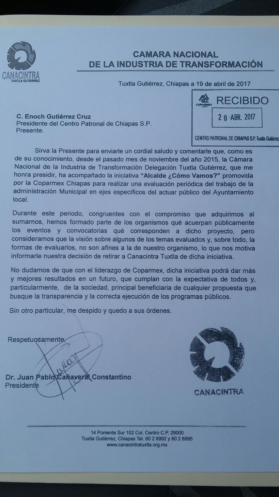 La Delegación Tuxtla Gutiérrez de la Cámara Nacional de la Industria de la Transformación (Canacintra) envió una carta dirigida a Enoch Gutiérrez Cruz, presidente del Centro Patronal de Chiapas, en la cual informa que por no estar de acuerdo con la metodología y la forma cómo se hace la evaluación, abandonan la iniciativa “Alcalde ¿Cómo Vamos?”