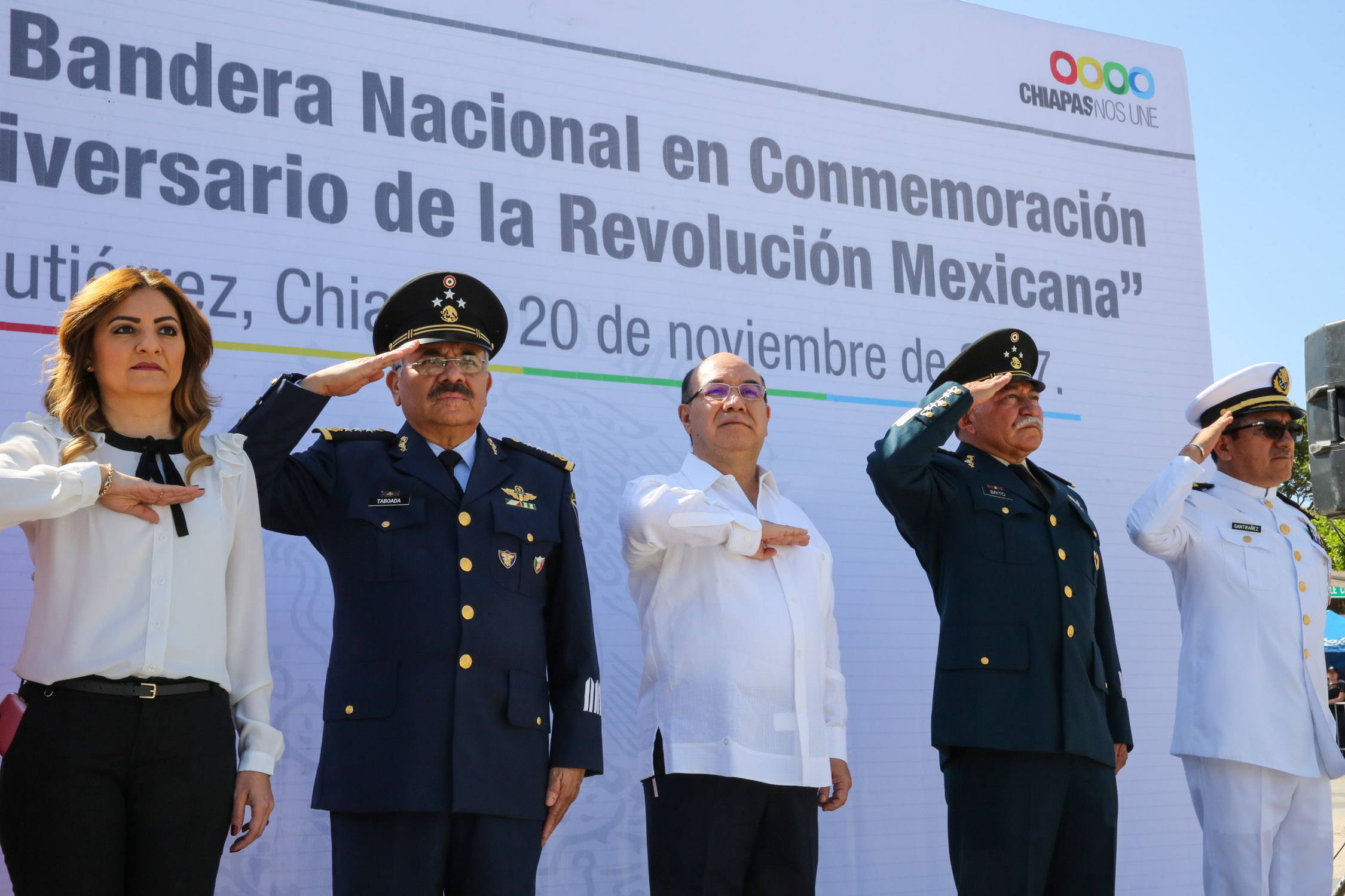 Acompañado por el Comandante de la VII Región Militar, General Luis Alberto Brito Vázquez; del Comandante de la Región Aérea del Sureste, General Álvaro García Taboada; del Comandante de la XXXI Zona Militar, General Ernesto José Zapata Pérez; del Capitán Manuel Santibáñez Pérez, representante de la XIV Zona Naval de Puerto Chiapas; del Presidente de la Mesa Directiva del Congreso del Estado, Williams Ochoa Gallegos; del Fiscal General del Estado, Raciel López Salazar; del Secretario de Educación, Roberto Domínguez Castellanos, miembros del Gabinete y Diputados locales, el responsable de la política interna destacó que uno de los mayores legados del movimiento revolucionario de 1910, fue demostrar la fuerza y capacidad que tiene el pueblo de México para cambiar positivamente su destino.