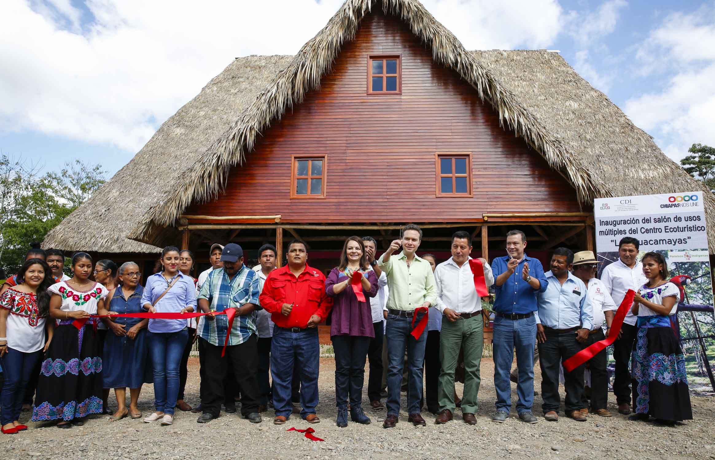 Durante esta gira de trabajo, la Directora de CDI, el Gobernador y el presidente de la Sociedad Cooperativa Ara Macao, Napoleón Hernández Marcelino, inauguraron un Salón de Usos Múltiples y recorrieron diferentes espacios del Centro Ecoturístico “Las Guacamayas”, donde reconoció el esfuerzo que realizan todos los días para hacer que dicho centro se encuentre entre los Paraísos Indígenas de la entidad, un lugar que preserva el medio ambiente y que de la misma forma genera ingresos para los pobladores.