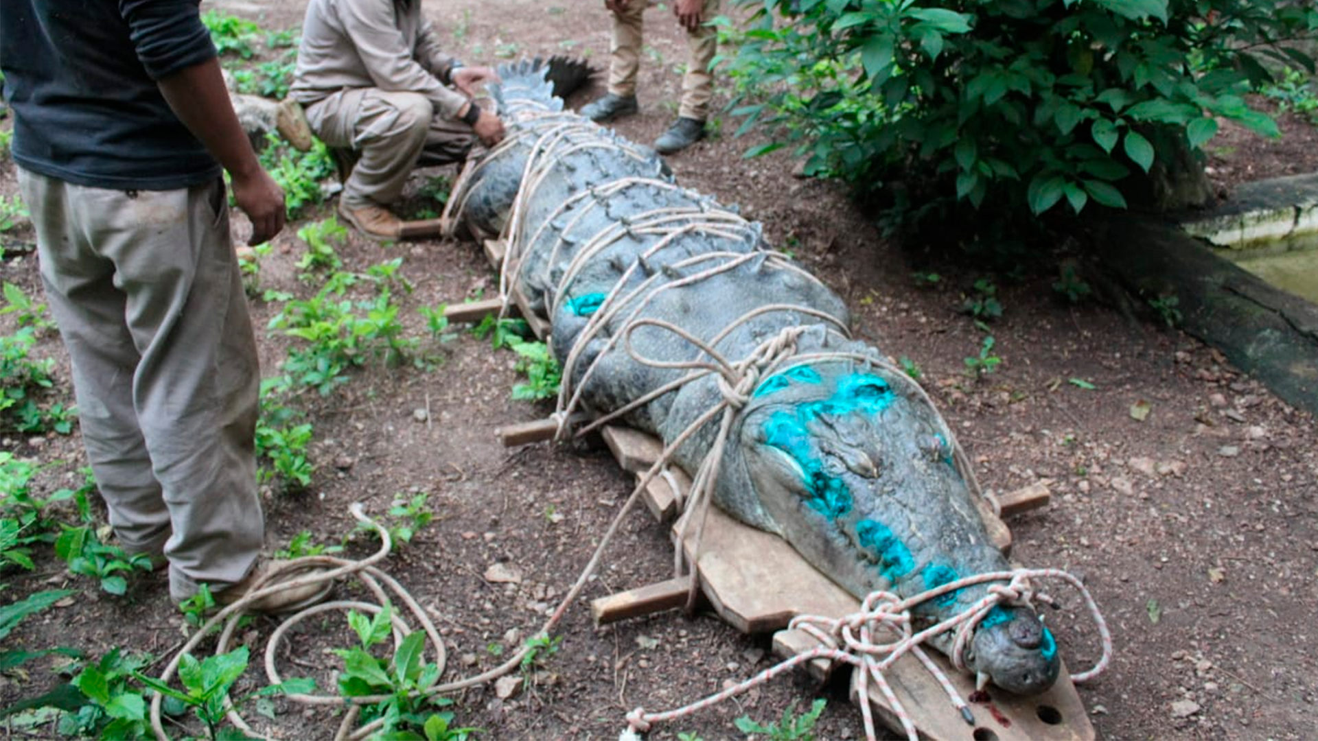 En el sitio referido se halló al cocodrilo inmóvil, pero aún con vida, tendido en el suelo y amarrado, por lo que se procedió a contenerlo debidamente para su traslado. Pudo observarse que presentaba múltiples lesiones en la cabeza, la mayoría provocadas por impactos de bala, que entre otras cosas lo habían dejado ciego.