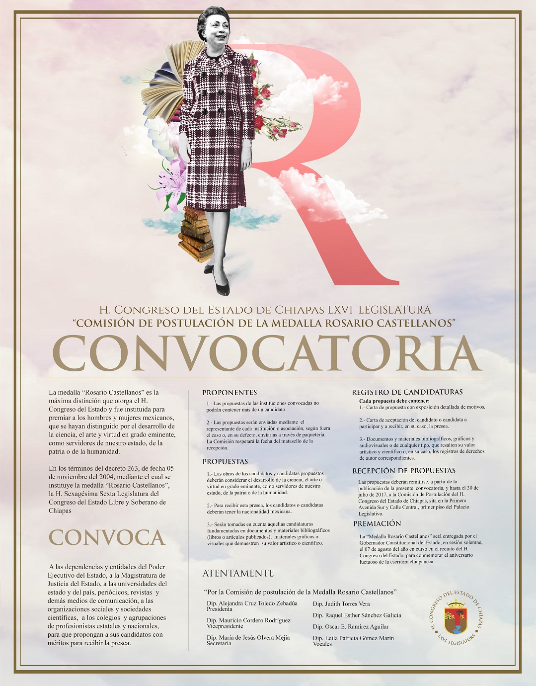 La Sexagésima Sexta Legislatura del H. Congreso del Estado de Chiapas, convoca a la postulación de candidatos para recibir la Medalla “Rosario Castellanos”, en su edición 2017, y que representa el máximo galardón que entrega el Poder Legislativo estatal.