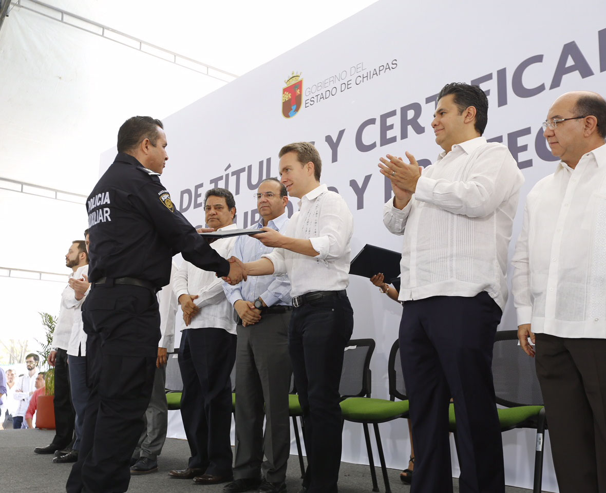 El secretario de Gobernación, Alfonso Navarrete Prida y el gobernador Manuel Velasco Coello entregaron títulos y certificados de la Licenciatura en Seguridad Pública y Protección Ciudadana a policías estatales, quienes a través de la preparación refrendan su compromiso con la población.