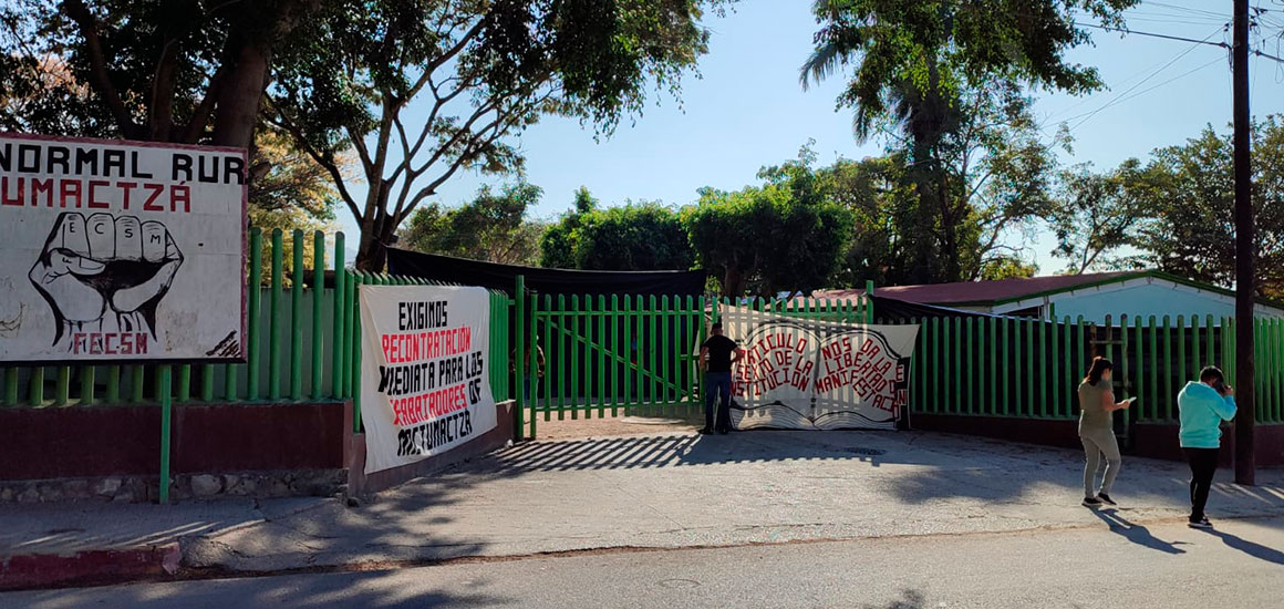 Mientras tanto, los normalistas cerraron los portones de la institución educativa, colocaron pancartas y con mantas y bolsas de plástico negras cubrían las rejas de la escuela para evitar observar el interior.