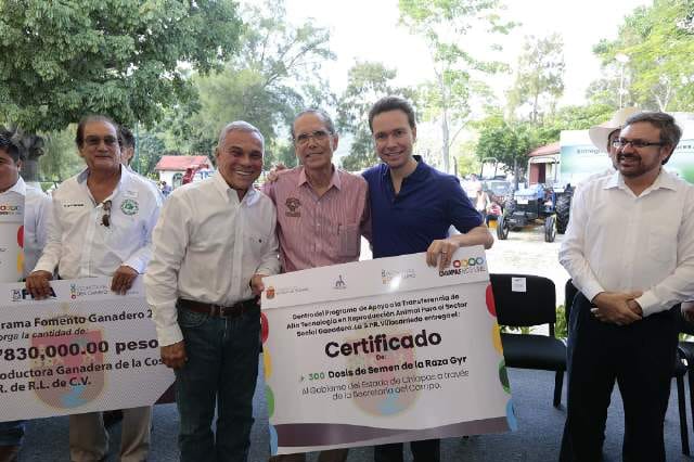Acompañado por el secretario del Campo, José Antonio Aguilar Bodegas, Velasco Coello señaló que con este tipo de apoyos, su gobierno contribuye a garantizar una genética especializada que permita tener una mayor producción de carne y una mejor calidad en la leche.