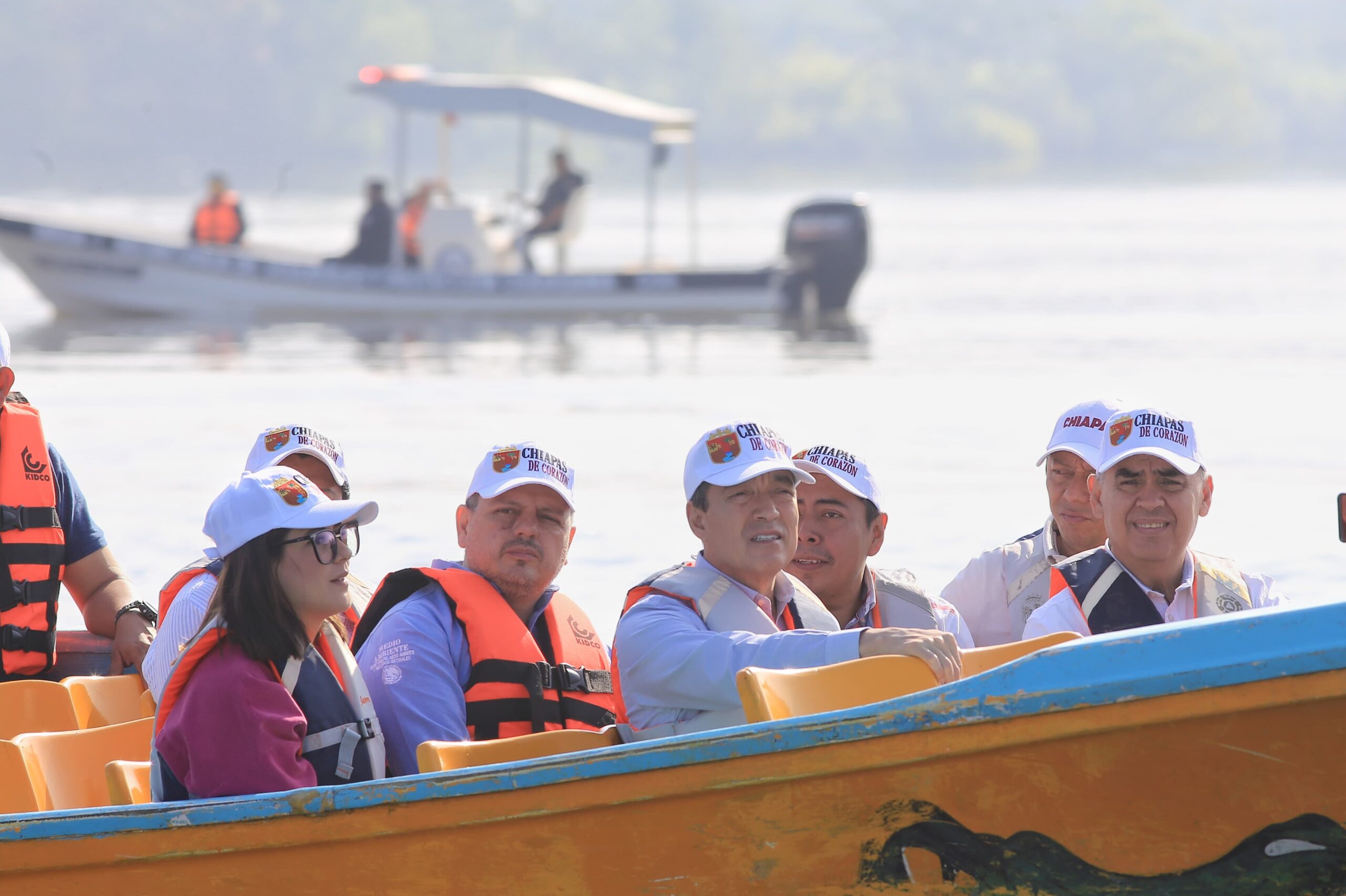 Acompañaron al mandatario estatal, el secretario de Protección Civil, Luis Manuel García Moreno; las secretarias de Medio Ambiente de Historia Natural, María del Rosario Bonifaz Alfonzo, y de Turismo, Katyna de la Vega Grajales, la encargada del despacho de la delegación de Semarnat en Chiapas, Guadalupe de la Cruz Guillén; el director regional Frontera Sur Istmo y Pacífico Sur de la Conanp, Pavel Palacios Chávez; la capitana de Puerto de Chiapa de Corzo de la Semar, Josefa Nayeli Pérez Aguilar, entre otros.