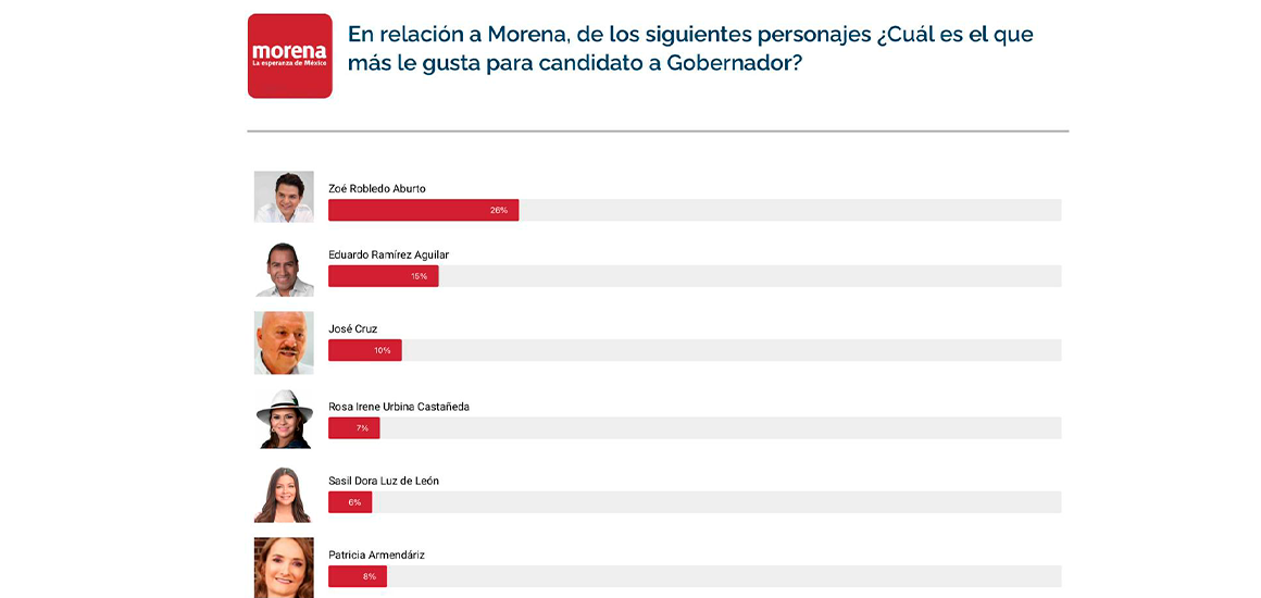 En esta medición la fórmula MORENA-Zoé Robledo alcanza una intención del 43%, mientras que Eduardo Ramírez Aguilar y el PT apenas alcanzan un 8%. Mientras que el Partido Acción Nacional se mantiene en segunda posición de preferencia partidista y de intención con un 13%.