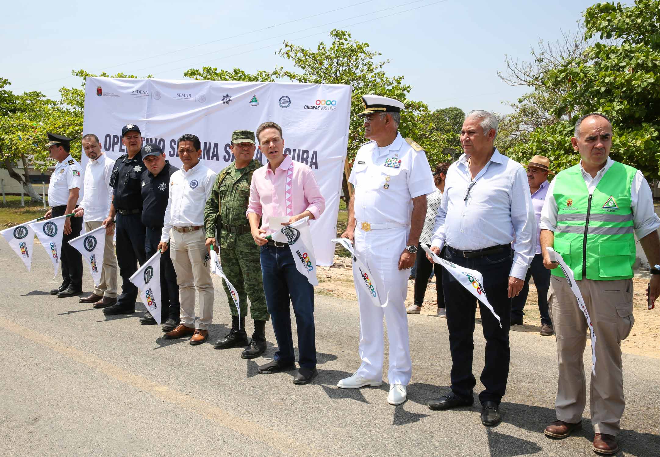 Acompañado del secretario de Seguridad y Protección Ciudadana, Jorge Luis Llaven Abarca; el Fiscal General del Estado, Raciel López Salazar; el secretario de Protección Civil, Luis Manuel García Moreno; así como representantes del Ejército Mexicano, la Marina, Policía Federal y comisionados en este rubro, el Gobernador dio el banderazo de salida a más de siete mil elementos federales, estatales y municipales, que trabajarán por mar, aire y tierra, durante las 24 horas del día, para resguardar la integridad de familias chiapanecas y visitantes.