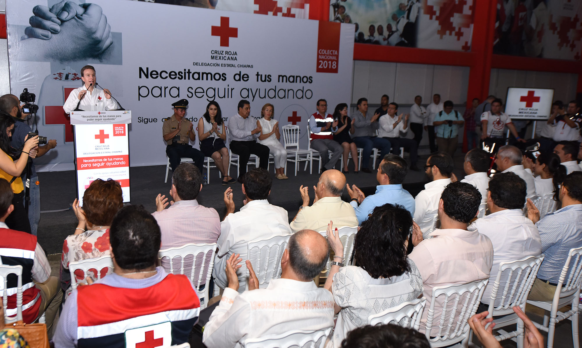 Junto a jóvenes voluntarias y voluntarios de la Cruz Roja Delegación Chiapas, el gobernador Manuel Velasco Coello puso en marcha la Colecta Nacional 2018, que permitirá fortalecer las operaciones de la benemérita institución que atiende más de 50 mil servicios en Chiapas.