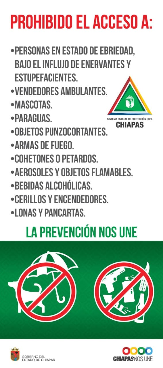 De igual manera se exhorta a no introducir bebidas alcohólicas, drogas u objetos inflamables, así como evitar llevar joyas o pertenencias de alto valor y al llegar al lugar es importante que ubique los módulos de atención a emergencias, que estarán para brindarle una oportuna atención.
