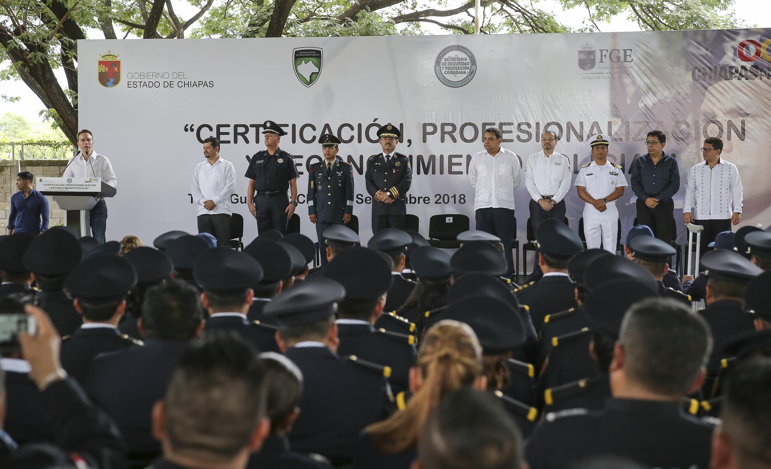 Al encabezar la entrega de certificados de Profesionalización y reconocimientos al Mérito a mujeres y hombres policías, el gobernador Manuel Velasco Coello resaltó que la preparación, formación y equipamiento de las corporaciones policiales, que se ha implementado durante su administración, ha permitido posicionar a Chiapas como uno de los estados más seguros del país.