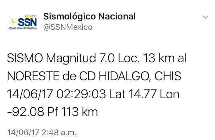 El Sistema Estatal de Protección Civil dio a conocer que tras el sismo registrado en Chiapas, a las dos de la mañana con 29 minutos, y que tuvo epicentro a 13 kilómetros al noroeste de Ciudad Hidalgo, de manera inmediata se activaron los protocolos de atención a la emergencia en donde hasta este momento con corte a las 8 de la mañana, afortunadamente, no se tiene el reporte de personas fallecidas.