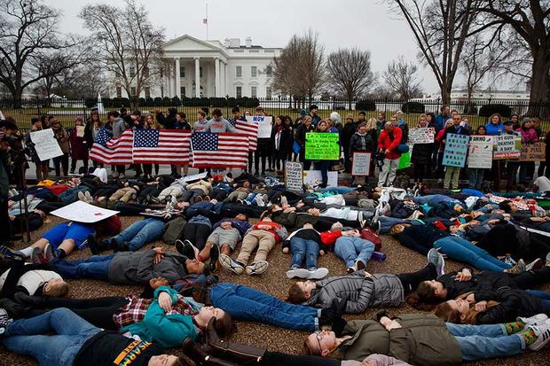 En varios turnos, distintos grupos de estudiantes se arrojaron al piso en la Avenida Pensilvania, justo delante de la Casa Blanca, durante 3 minutos cada vez, para simbolizar el poco tiempo que tardó el autor del tiroteo de Florida, Nikolas Cruz, en comprar el rifle semiautomático AR con el que perpetró la matanza.