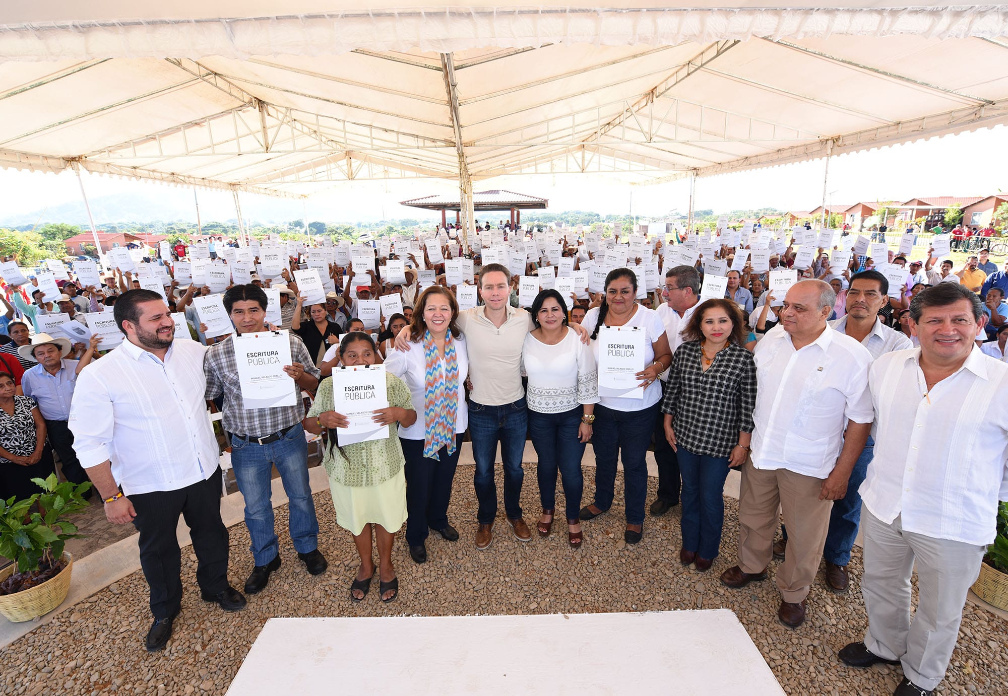 Con la entrega escrituras públicas, el gobernador Manuel Velasco Coello brindó certeza jurídica sobre su patrimonio a 625 familias del municipio de Ángel Albino Corzo.
