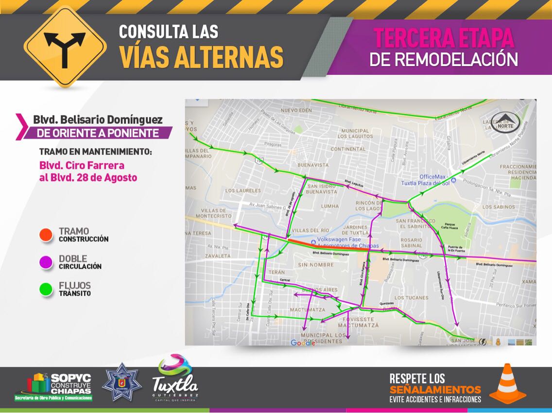 Como parte de la tercera etapa de remodelación del Bulevar Belisario Domínguez, la Secretaría de Obras Públicas del Estado y el Ayuntamiento de Tuxtla Gutiérrez dieron a conocer que ya dieron inicio los trabajos en esta vía, motivo por el cual la circulación desde el Bulevar Ciro Farrera hasta la calle 28 de Agosto, sobre el carril de oriente a poniente, se encuentra cerrada.