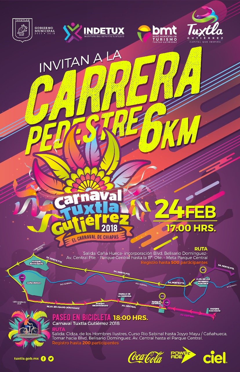 Como parte de la gran fiesta del “Carnaval Tuxtla Gutiérrez 2018”, el alcalde Fernando Castellanos Cal y Mayor hizo extensiva la invitación a las y los tuxtlecos para que asistan a la Carrera Pedestre de 6 kilómetros y posteriormente al Paseo en Bicicleta, este sábado 24 de febrero, a partir de las cinco de la tarde.