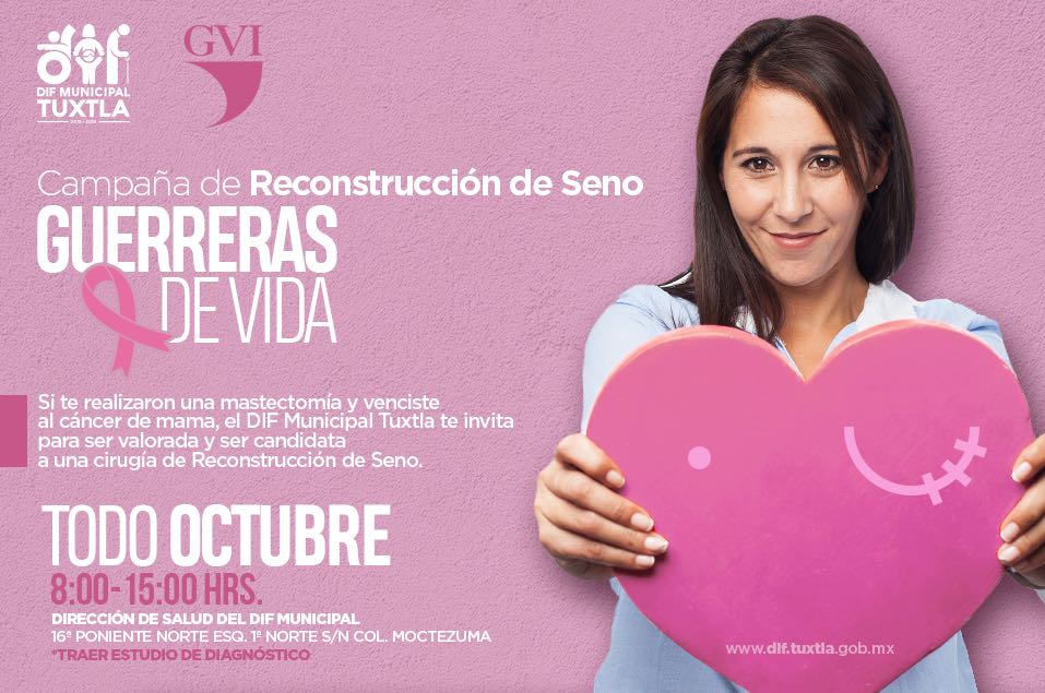 Con el propósito de que mujeres que vencieron al cáncer de mama puedan acceder a una cirugía de reconstrucción de seno de forma gratuita, el presidente de Tuxtla Gutiérrez, Fernando Castellanos Cal y Mayor, a través del Sistema DIF Municipal, invita a todas las tuxtlecas a participar en la campaña “Guerreras de Vida”.