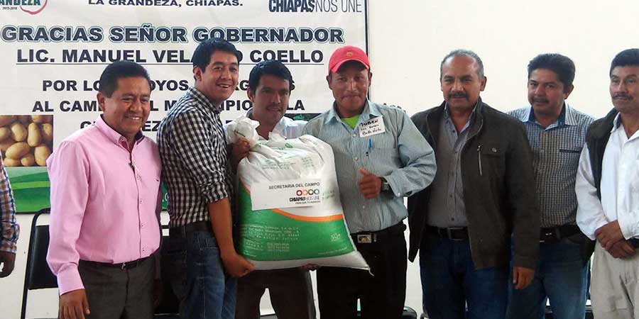 Como parte de la instrucción que el gobernador Manuel Velasco Coello ha dado, de respaldar al sector agropecuario de Chiapas, para darle un mayor impulso y fortalecimiento, la Secretaría del Campo, que encabeza José Antonio Aguilar Bodegas y los Ayuntamientos Municipales de La Grandeza, Motozintla, Bellavista y El Porvenir, realizaron la entrega de apoyos en tiempo y forma a productores de papa de dicha región.