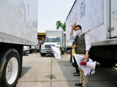 El director general del Instituto Mexicano del Seguro Social (IMSS), Zoé Robledo, dio el banderazo de salida a una caravana de camiones que trasladan un millón de mascarillas para los trabajadores de la salud que atienden la emergencia sanitaria por COVID-19 en unidades médicas y hospitales del IMSS en todo el país.