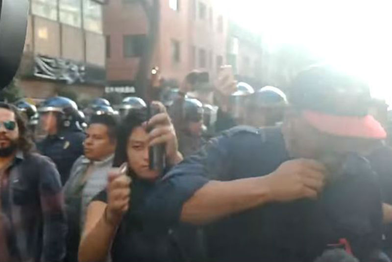 En un video difundido a través de redes sociales se aprecia el momento exacto en que una mujer que se escondía entre policías y manifestantes para tomar por sorpresa a un periodista que se encontraba en el lugar.