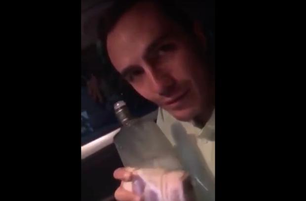El político, en evidente estado de ebriedad, se expresa con palabras altisonantes y le da un trago a la botella que sostiene.