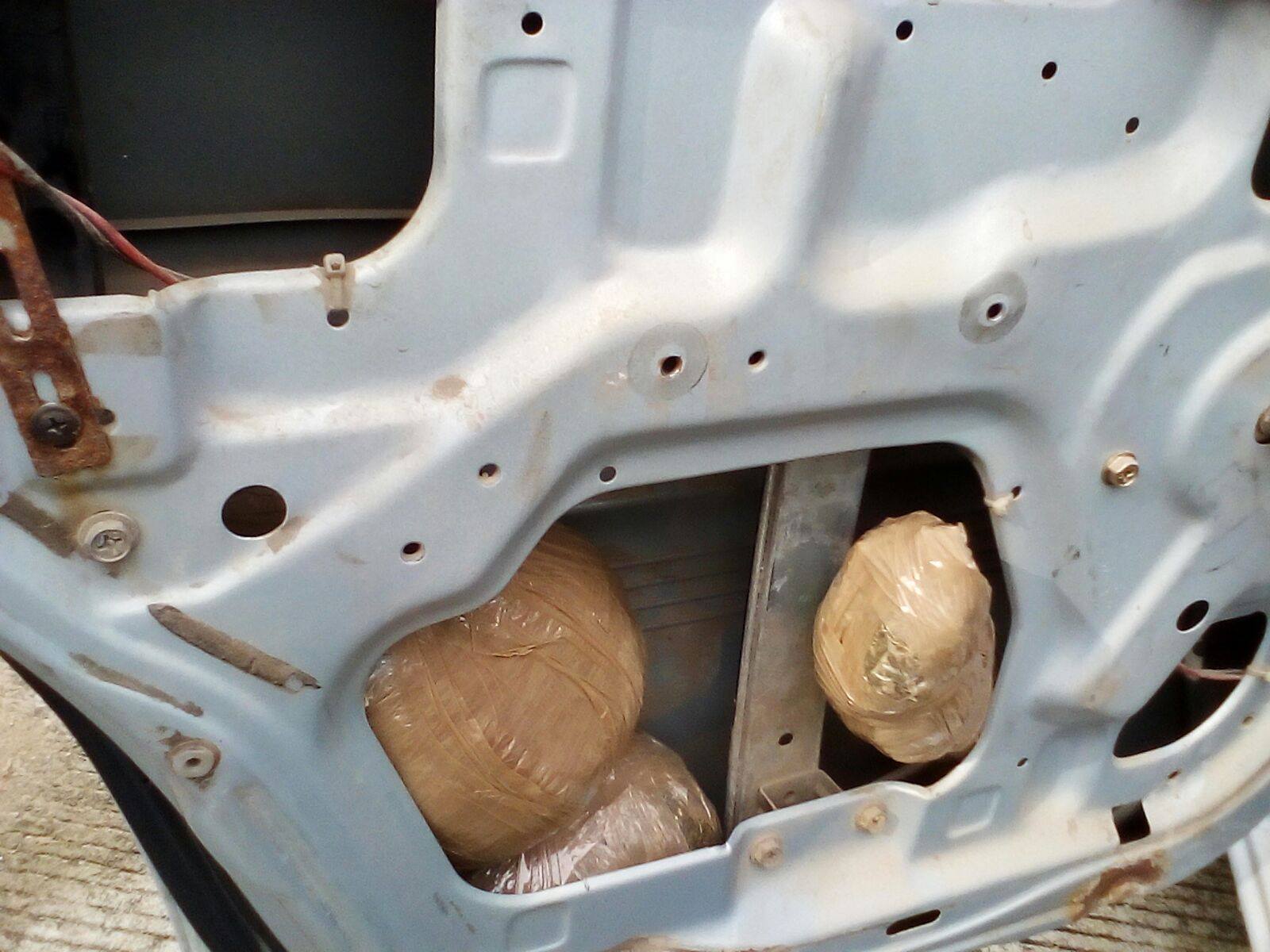 El vehículo de la marca Nissan tipo Tsuru de color blanco con placas de circulación DRF-6873 del estado de Chiapas, fue corroborada que se encontraba abandonada y que no pertenecía a ningún habitante, por lo que le fue practicada una inspección, localizando en la puerta izquierda trasera del lado del conductor, ocultos tres paquetes confeccionados en cinta canela, conteniendo al parecer marihuana.