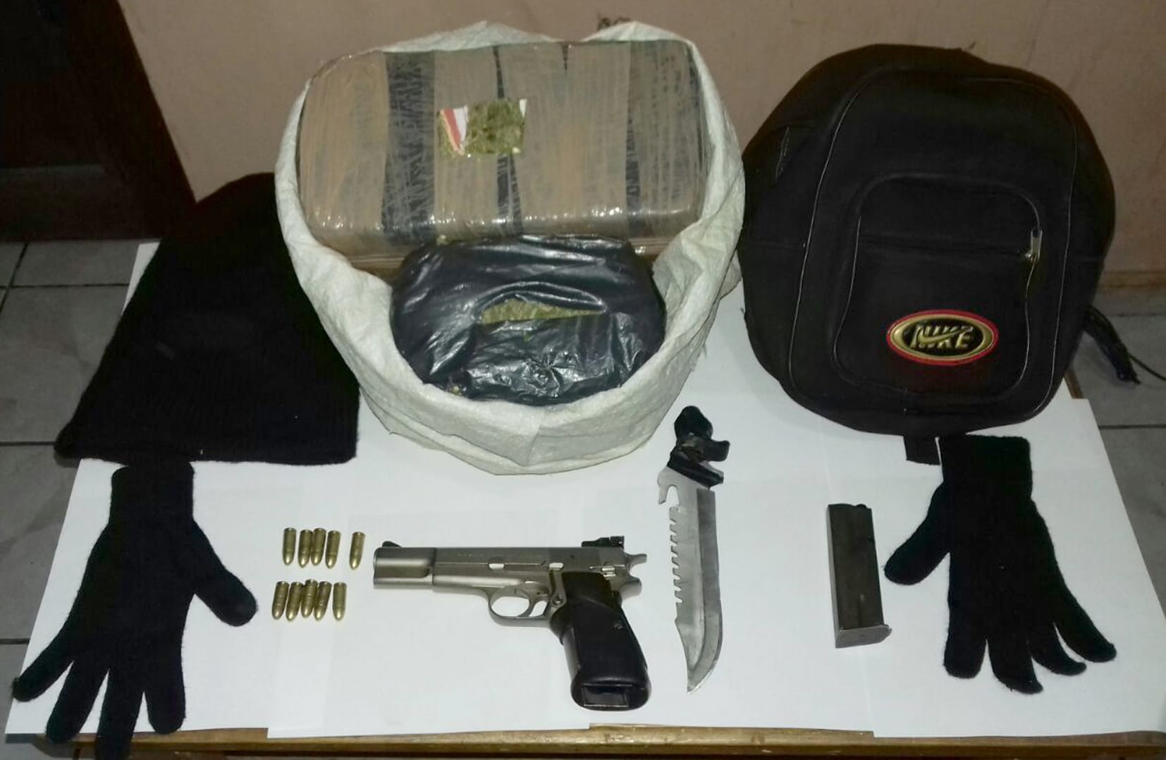Ante los hechos, los cuerpos de seguridad lograron detener a Luis “N” de 31 años de edad, a quien se le aseguró un total de seis kilogramos de hierba verde y seca con las características propias de la marihuana, una pistola tipo escuadra, calibre 9 milímetros, abastecida con 10 cartuchos útiles, un cuchillo, así como un pasamontaña y unos guantes.