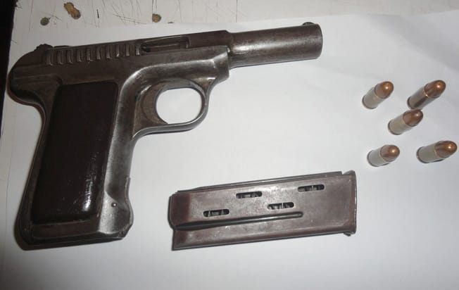 Asimismo a la altura de la cintura, se le aseguró un arma de fuego, tipo escuadra calibre 22 milímetros, abastecida con 9 cartucho útiles, de la cual no acreditó el permiso correspondiente.