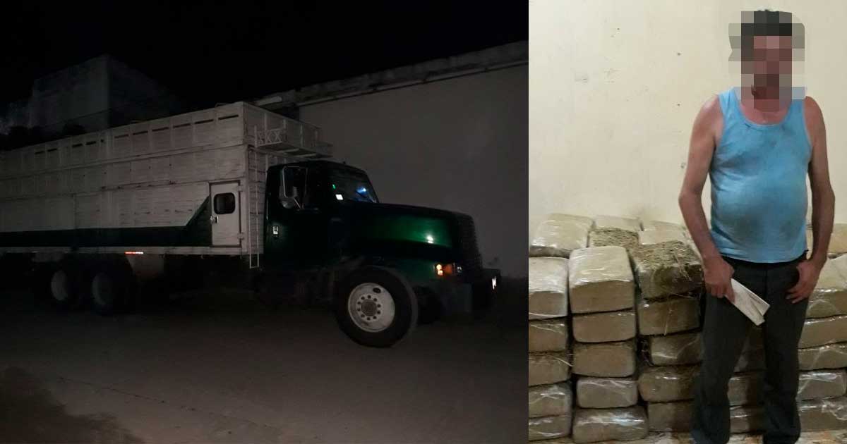 La unidad transitaba sobre el tramo carretero Federal Tapanatepec, Oaxaca a Tonalá, Chiapas, lugar en donde se ubica un punto de inspección, en el que agentes realizaron una revisión de rutina, detectado oculto dentro de pastura para ganado, 102 paquetes confeccionados con cinta canela de los denominados Ladrillos, conteniendo hierbe verde y seca con las características propias de la marihuana.